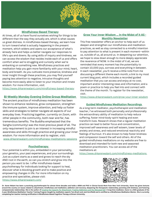 Dr. Karen Walant is licensed to practice Online Therapy in Massachusetts, Connecticut, New York and Virginia. She also works with clients anywhere in the world as a Mindfulness Meditation Coach, Teacher and Support, as well as facilitates online MBCT courses across the country. To schedule an initial session, please contact Karen directly.